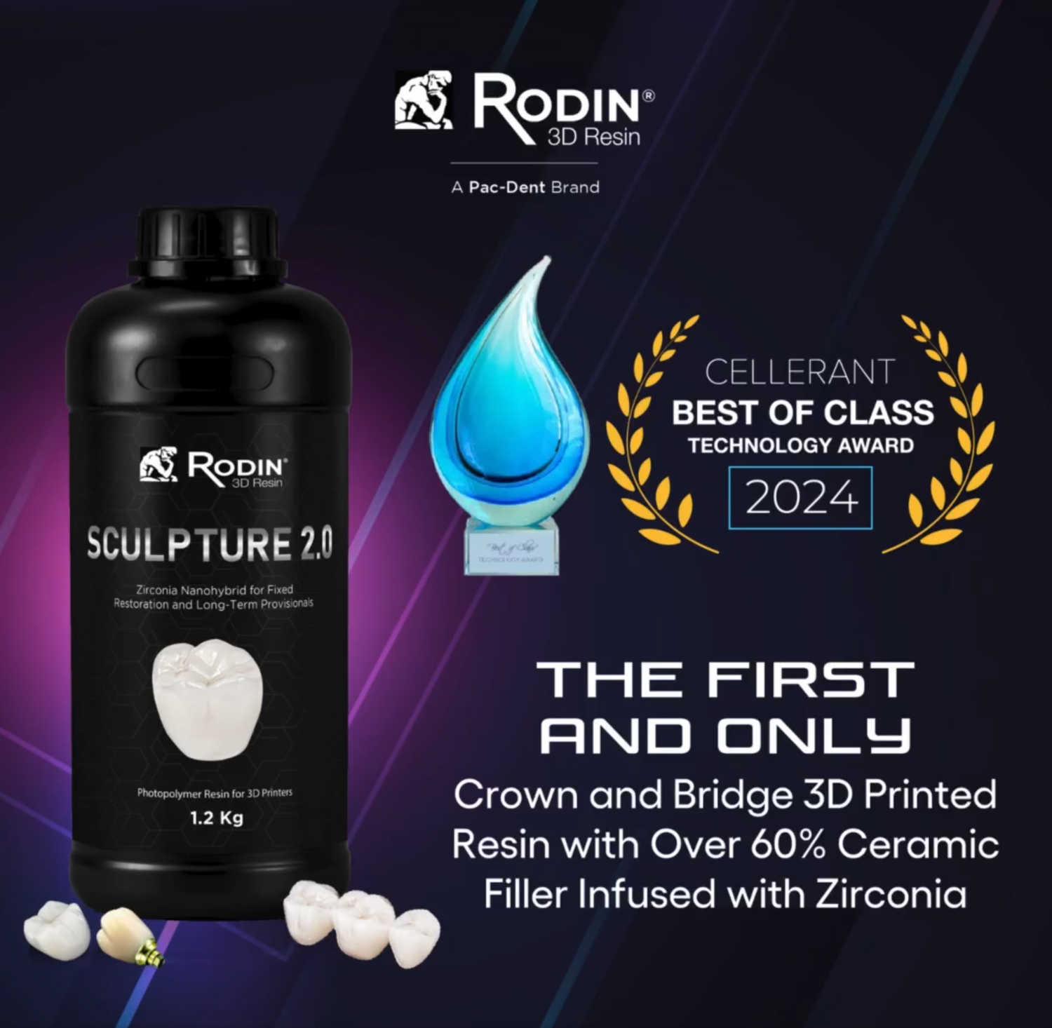 Rodin® Sculpture 2.0 is a monumental evolution of our crown and bridge ceramic-nanohybrid designed to transcend the standards of permanent dental restorations. This next-generation resin achieves unparalleled levels of flexural strength and ceramic filler content, redefining what can be achieved through 3D printing restorations. Featuring a massive increase in ceramic filler content of over 60%. The resin’s exceptional Biaxial Strength clocks in at over 200 MPa, far above the strength of other permanent crown and bridge resins.