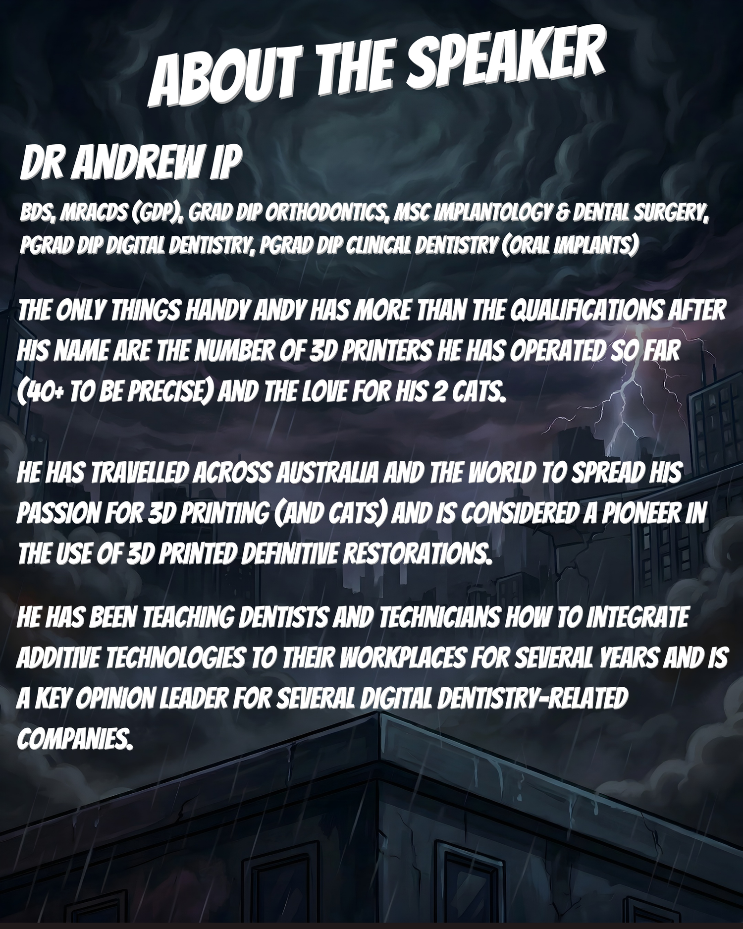 Dr Andrew Ip is a Sydney-based private general dentist who has presented on 3D printing in a dental practice on multiple occasions. He achieved Membership in General Dental Practice with the Royal Australasian College of Dental Surgeons in 2017 and obtained a Graduate Diploma of Orthodontics at James Cook University in 2019 and a Masters of Science in Implantology and Dental Surgery in 2022.